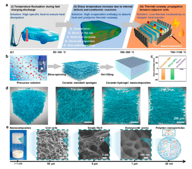 圖 1. (a) 實(shí)際全生命周期熱安全管理的要求和解決方案。 (b) 從陶瓷溶膠到陶瓷-水凝膠納米復(fù)合材料的轉(zhuǎn)化過程。 (c) 不同材料的表面 zeta 電位。 (d) 源自 X 射線顯微斷層掃描的納米復(fù)合材料的 3D 重建。 (e) 制造的陶瓷-水凝膠納米復(fù)合材料相關(guān)尺寸的示意圖。