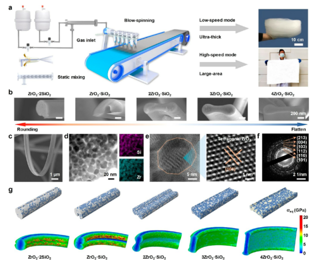 圖 2. (a) 通過靜態(tài)混合輔助溶液-吹塑-紡絲法批量生產(chǎn)陶瓷納米帶海綿。 (b) 不同成分的陶瓷納米帶的橫截面 SEM 圖像。 (c) SEM 圖像顯示單個(gè)納米帶的超低曲率半徑。 (d) 陶瓷納米帶的明場(chǎng) TEM 圖像,說明了玻璃陶瓷結(jié)構(gòu)。 右圖:對(duì)應(yīng)的 EDS 映射。 (e) 陶瓷納米帶的 HR-TEM 圖像顯示了 ZrO