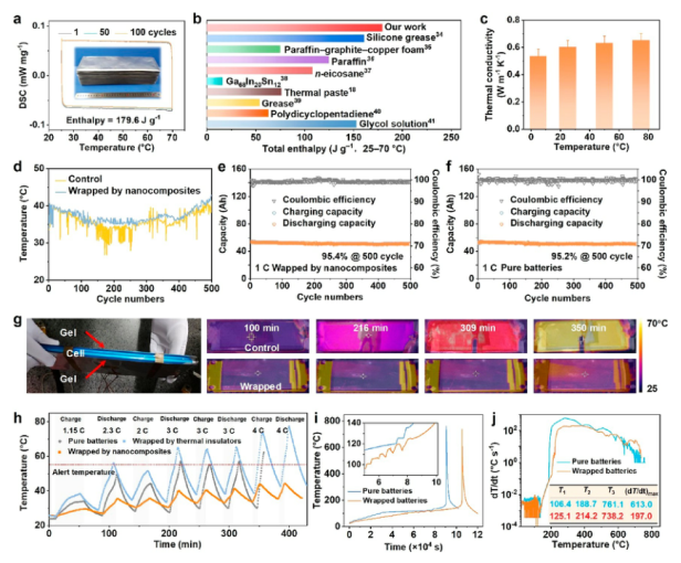 圖 4. (a) 陶瓷-水凝膠納米復(fù)合材料的循環(huán) DSC。 插圖:由鋁塑薄膜封裝的納米復(fù)合材料。 (b) 比較報(bào)告的相變材料和冷卻劑之間的材料焓。 (c) 納米復(fù)合材料的熱導(dǎo)率。 (d) 長(zhǎng)循環(huán)實(shí)驗(yàn)中電池表面的溫度波動(dòng)。 (e 和 f) 由納米復(fù)合材料包裹的四電池模塊在 1 C 下沒有保護(hù)的循環(huán)性能。(g) 測(cè)試的單電池照片及其在 100 至 350 分鐘放電過程中的 IR 圖像。 (h) 三個(gè)電池在充電和放電期間的溫度曲線。 (i 和 j) 純和納米復(fù)合材料包裹電池的 TR 溫度圖和通過 ARC 測(cè)試測(cè)量的相應(yīng)溫度升高率。