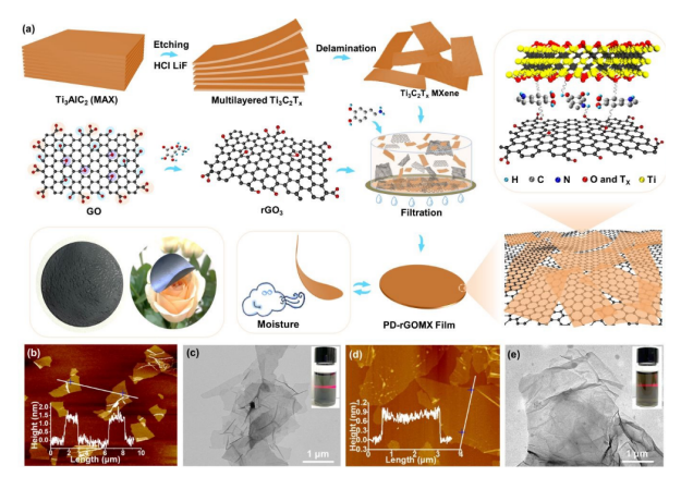 圖1.MXene和rGO組裝成的PD-rGOMX致動器的合成過程和形貌表征。