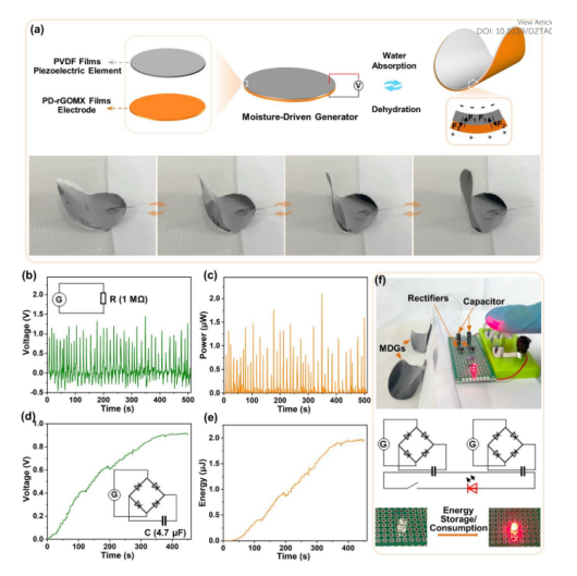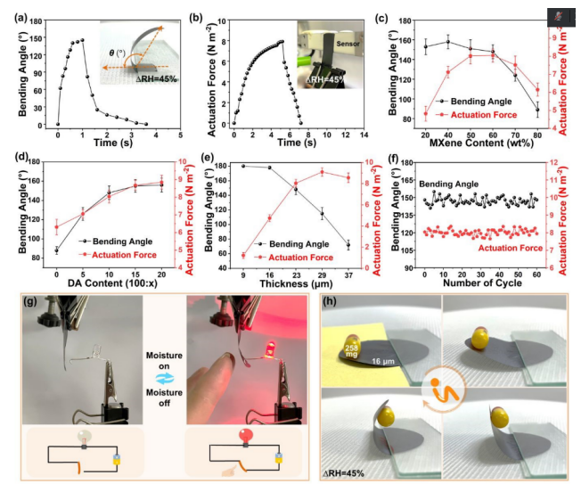 -1),機械性能和濕度敏感性。卓越的綜合性能使執行器能夠檢測指尖的濕度,作為非接觸式開關打開電路,或作為機器人移動貨物。更重要的是,將該致動器與壓電元件耦合,設計并組裝了一種濕度驅動發電機,在水分子梯度驅動下可連續輸出峰值電壓約1V的交流電流。這項研究強調了這款濕度響應型致動器的巨大應用潛力,并為開發高級多功能基于MXene的濕度響應驅動器提供了模板。