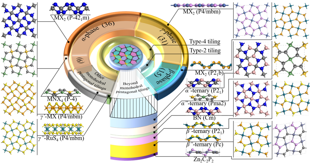 北京大學材料科學與工程學院王前教授課題組長期致力于新型碳材料的模擬設計及其性能研究。自2015年課題組提出碳的二維新型同素異形結構“penta-graphene(五邊形石墨烯)”【Proc. Natl. Acad. Sci. 112, 2372 (2015)】以來,五邊形石墨烯不僅因其獨特的幾何構型和新奇的性質受到廣泛關注,而且為其它五邊形二維材料的設計提供了新的原子結構模型。迄今為止,提出了130余種以五邊形為結構單元的二維新材料,其中,采用實驗方法合成了五邊形二硒化鈀、五邊形二氮化鎳及五邊形硅烯納米帶等。