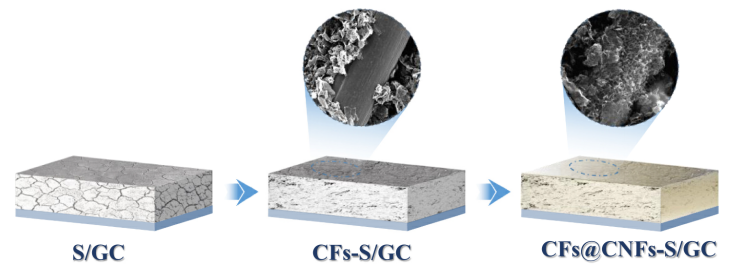 圖1. S/GC、CFs-S/GC和CFs@CNFs-S/GC陰極示意圖。