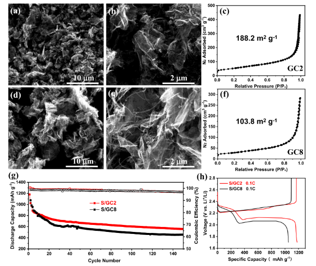 2吸附/脫附等溫線。(g) 電流速率為0.2C時的循環性能,和(h)電流速率為0.1C,含硫3mg cm