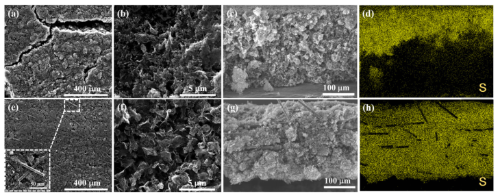 圖4. 循環100次后,得到(a, b) S/GC2和(e, f) CFs-S/GC2陰極俯視圖的SEM圖像。(c, d) S/GC2陰極和(g, h) CFs-S/GC2陰極對應S元素映射的截面圖。