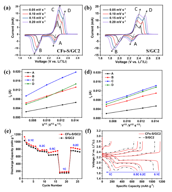 -l時的CV曲線。以及(c) CFs-S/GC2和(d) S/GC2陰極的掃描速率v