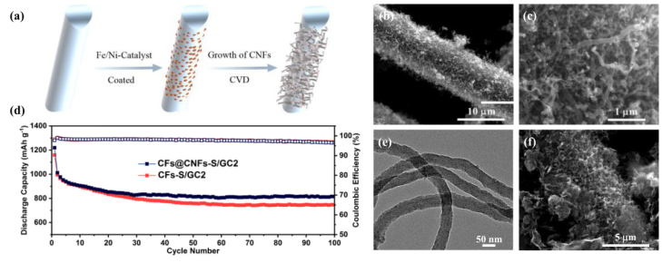 圖6. (a) CFs@CNFs增長過程示意圖。(b, c) CFs@CNFs復合材料的SEM圖,CNFs的TEM圖和(f) CFs@CNFs-S/GC2陰極的SEM圖。(d) CFs-S/GC2和CFs@CNFs-S/GC2陰極在0.2C時的循環性能。