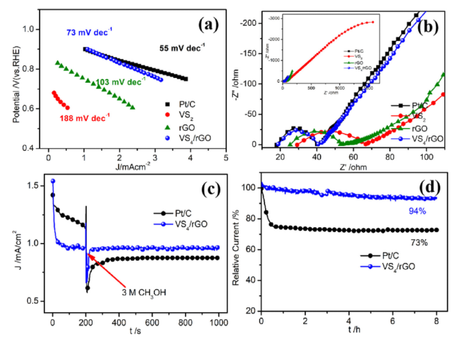 4和Pt/C加入3 M甲醇前后的計時安培響應。(d) rGO改性VS