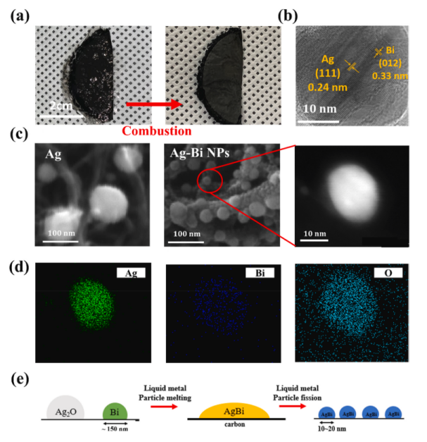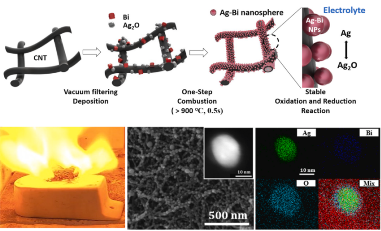 碳基材料中的雙金屬納米結構可以克服能源材料的基本限制,這是單一材料無法獲得的。然而,它們的合成過程耗時且復雜,會導致相/界面偏析和金屬元素分布不均勻。在此,我們報告了一種簡單的燃燒驅動合成雙金屬Ag-Bi納米顆粒(NP)錨定碳納米管(CNT)電極。一步燃燒波通過由Ag