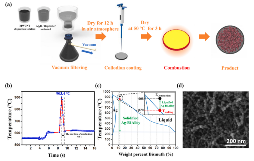 2O、Bi粉末和硝化纖維素組成的前驅體的制備,以及通過燃燒法制備的碳納米管上活性材料的產物。(b)由燃燒引起的熱化學反應的實時溫度變化,導致1 s內的快速加熱-冷卻。(c) Ag-Bi合金的二元相圖。(d)燃燒合成后Ag-Bi NP錨定CNT網絡的SEM圖像。