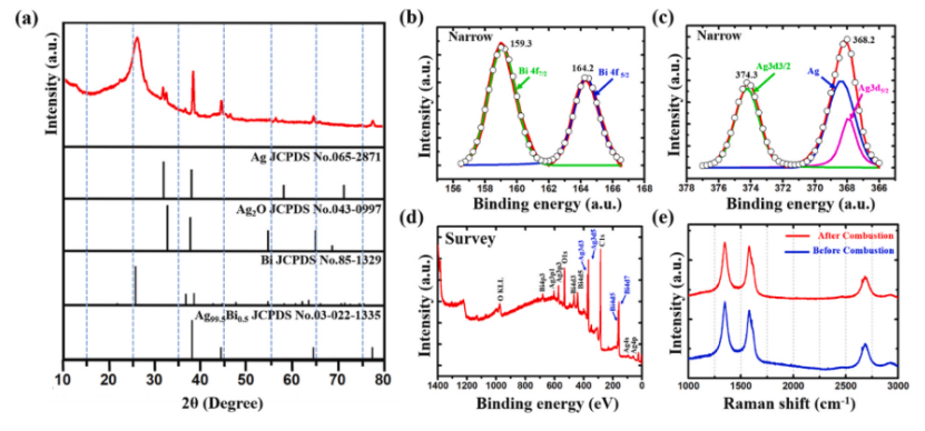 圖5 錨定在CNTs的Ag-Bi 納米顆粒的物理化學表征。(a) Ag-Bi的XRD, (b) Bi, (c) Ag在CNTs上的XPS譜圖,(d) Ag - Bi雙金屬納米結構的測量分析。(e)燃燒合成前后Ag