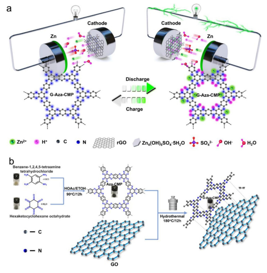 Figure 1. (a) 具有2M ZnSO4電解質(zhì)的水系 G-Aza-CMP//Zn 電池系統(tǒng)中H+ /Zn2+存儲(chǔ)機(jī)制的示意圖。(b) Aza-CMP 和 G-Aza-CMP 的合成路線。