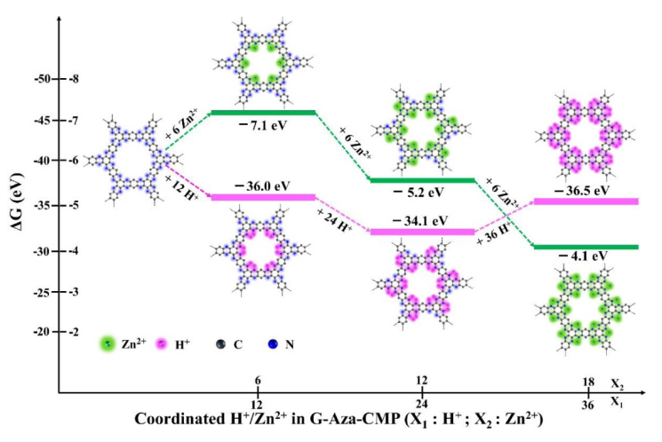 Figure 7. G-Aza-CMP與不同數(shù)目的H+/Zn2+結(jié)合的吉布斯自由能模擬分析。