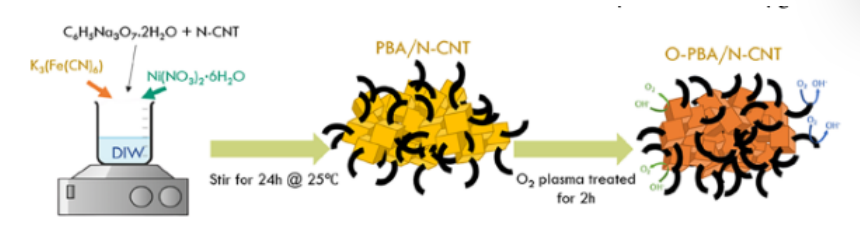 方案 1. O-PBA/N-CNT 雙功能電催化劑用于氧轉化反應的合成過程。