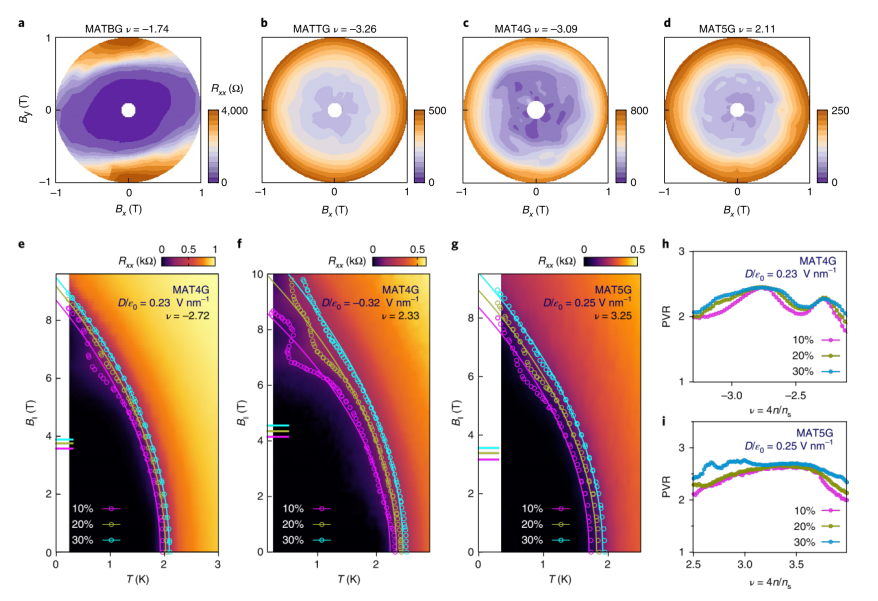 T = 0.2 K (d)。 MATBG 在其面內(nèi)臨界場中顯示出具有雙重對稱性的各向異性響應,而其他三個系統(tǒng)沒有顯示出任何各向異性。在 MAT4G(設備圖 4B) 和 MAT5G (設備 5B) (g) 中的 (3.25, 0.25 V nm