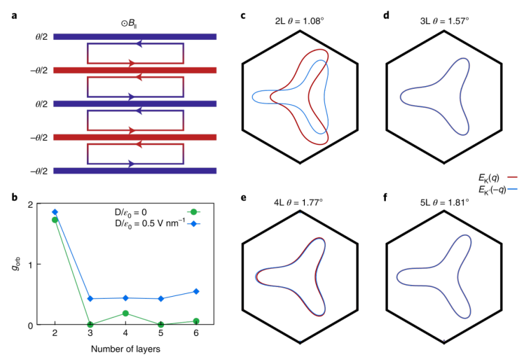 Figure 1. 魔角多層石墨烯。 (a)扭曲多層石墨烯,在相鄰層之間具有交替的扭曲角