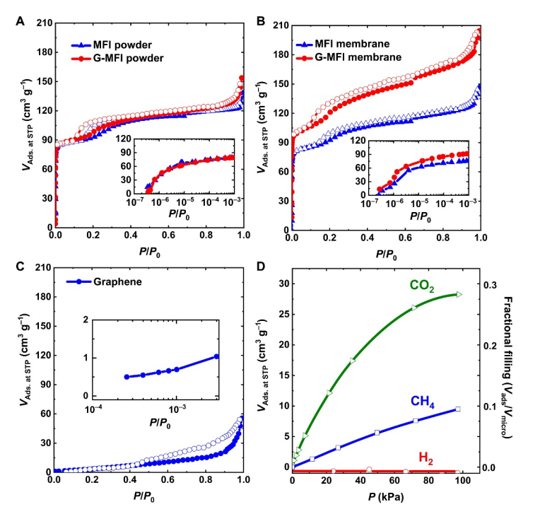 Figure 2. G-MFI 膜的孔隙率由77 K下的 N2吸附確定。( A ) G-MFI 和 MFI 粉末的 N2吸附 (Ads.) 等溫線。插圖是相應(yīng)的半對數(shù)圖。STP,標(biāo)準(zhǔn)溫度和壓力。( B ) G-MFI和MFI膜的N2吸附等溫線。插圖是相應(yīng)的半對數(shù)圖。( C )壓縮石墨烯的N2吸附等溫線。插圖是相應(yīng)的半對數(shù)圖。( D ) 吸附等溫線和 H2、CO2和 CH4的部分填充對壓力作圖。液體 H2的密度(0.0711 g cm