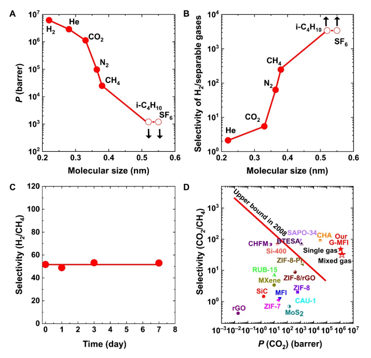 Figure 3. G-MFI膜的氣體分離性能。( A ) H2、He、CO2、N2、CH4、i-C4H10和SF