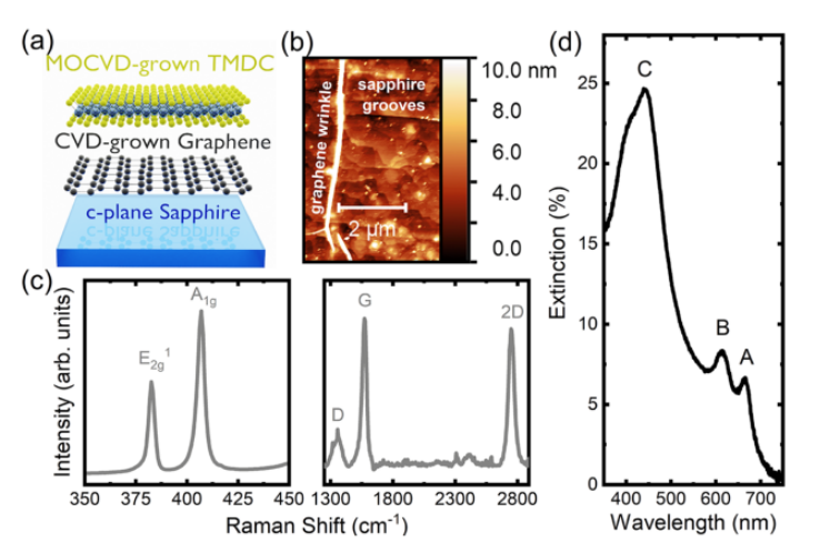 對(duì)于超薄、靈敏的光電探測(cè)器來(lái)說(shuō),一種有前途的策略是將光活性半導(dǎo)體過(guò)渡金屬二硫?qū)倩?(TMDC) 單層(如 MoS2)與高導(dǎo)電性石墨烯相結(jié)合。 這種設(shè)備通常表現(xiàn)出復(fù)雜而矛盾的光響應(yīng),因?yàn)槿肷涔饪梢杂|發(fā)光導(dǎo)和光誘導(dǎo)分子從表面的解吸。 在這里,我們使用金屬有機(jī)化學(xué)氣相沉積 (MOCVD) 在石墨烯上直接生長(zhǎng) MoS2,然后通過(guò)化學(xué)氣相沉積 (CVD) 將 MoS2 沉積在藍(lán)寶石晶片上,以實(shí)現(xiàn)石墨烯-MoS2 光電探測(cè)器。雙色光泵-電探針實(shí)驗(yàn)允許將光誘導(dǎo)的載流子轉(zhuǎn)移通過(guò)石墨烯-MoS2異質(zhì)界面與吸附物誘導(dǎo)的效應(yīng)分開(kāi)。 我們證明吸附物強(qiáng)烈改變了光電導(dǎo)率的大小和符號(hào)。 這歸因于在吸附物被解吸的情況下石墨烯摻雜從 p 型到 n 型的變化,而在任何一種情況下,光生電子都從 MoS2 轉(zhuǎn)移到石墨烯。 這種無(wú)損探測(cè)方法揭示了電荷載流子轉(zhuǎn)移機(jī)制和吸附物在二維 (2D) 異質(zhì)結(jié)構(gòu)光電探測(cè)器中的作用
