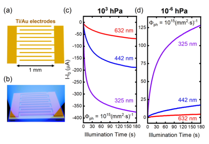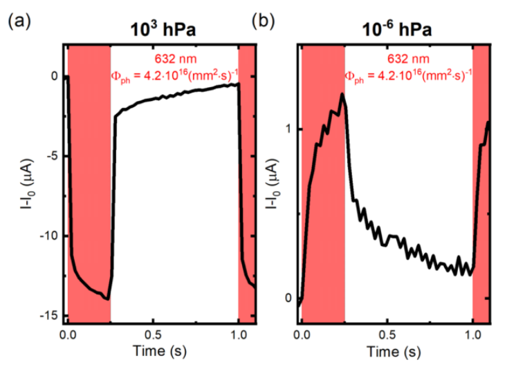 2 光電探測(cè)器的照明; (c) 在環(huán)境條件下(相對(duì)濕度:45 ± 5%,溫度:20 ± 1 °C)下 I - I0 的時(shí)間相關(guān)測(cè)量; (d) 在真空條件下。 比較了 λ