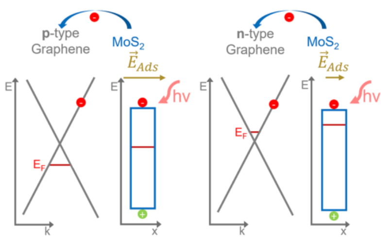 2異質(zhì)結(jié)構(gòu)器件中所提出的光響應(yīng)機(jī)制的示意圖。 左:高密度吸附物的情況,其中吸引電子的吸附物導(dǎo)致石墨烯中的費(fèi)米能級(jí)低于狄拉克點(diǎn),即 p 摻雜。 右圖:低密度吸附物的情況,其中吸附物密度降低導(dǎo)致費(fèi)米能增加,即 n 摻雜石墨烯。 在任何一種情況下,在 632 nm 照射下,MoS