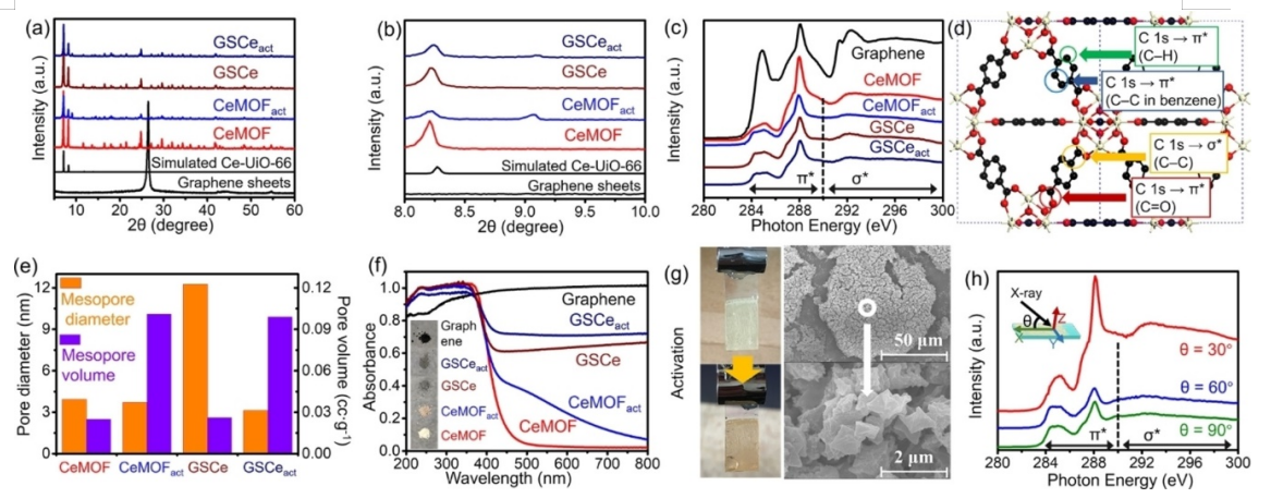 Figure 2. CeMOF、CeMOFact、GSCe 和 GSCeact的結構表征。a) 5–60°和 b) 8–10°處樣品和模擬 Ce-UiO-66 結構的 XRD 圖譜;c) 樣品和石墨烯的 C K-edge XANES 光譜;d) Ce-UiO-66的晶體結構;e) 樣品的孔隙率;f) 樣品的圖像和 UV/Vis DRS 光譜;g)Ce-UiO-66涂層ITO玻璃活化前后的照片和SEM圖片;h) 預活化后 Ce-UiO-66 涂層 ITO 玻璃的角度變化 C K 邊緣 XANES 光譜。