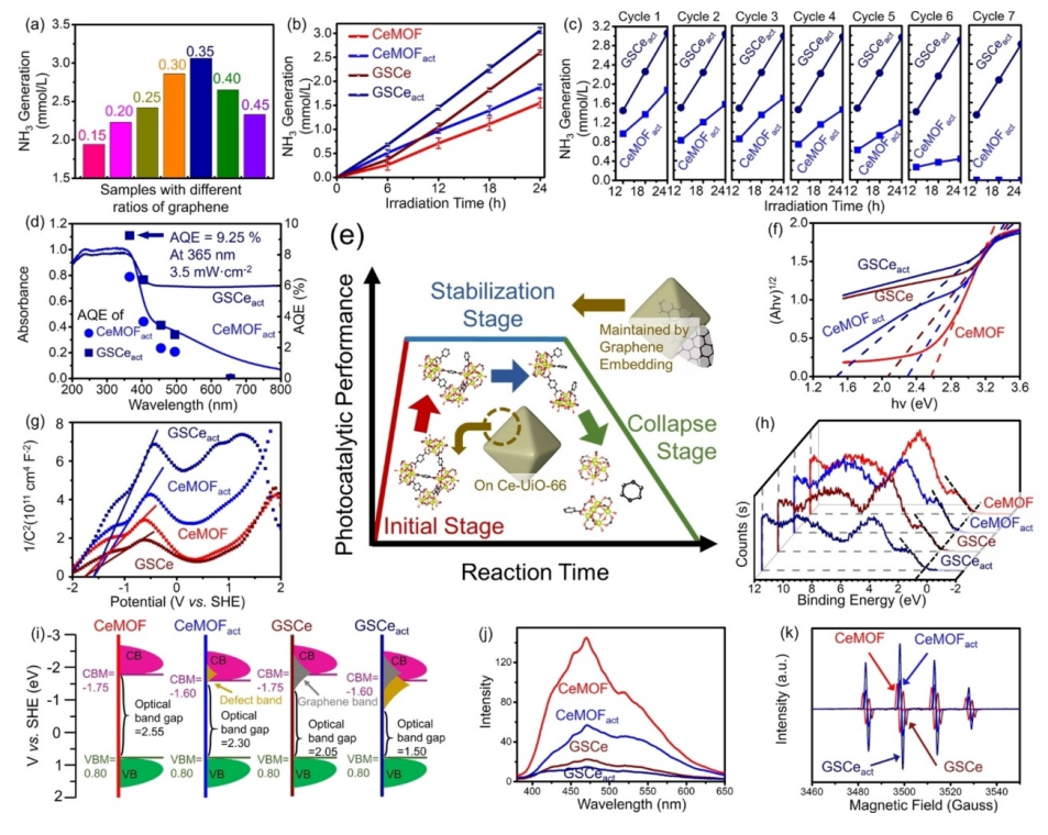 Figure 4. GSCe光催化劑的光催化性能和能帶結構。a)具有不同石墨烯片比例的預活化 GSCe 生成NH3 ;b)樣品在預活化前 (CeMOF, GSCe) 和預活化后 (CeMOF act , GSCe act ) 生成NH 3;c) 光催化固氮循環實驗結果;d) CeMOF act和 GSCe在不同波長照射下的 UV/Vis DRS 和 AQE;e) Ce-UiO-66 活化的三個階段;f) 樣品中的光學帶隙;g) 樣品的莫特-肖特基圖;h) 樣品的 VBXPS 光譜;i) 樣品的能帶結構;j) 樣品的 FL 光譜;k) 樣品的羥基自由基表征 EPR 光譜。