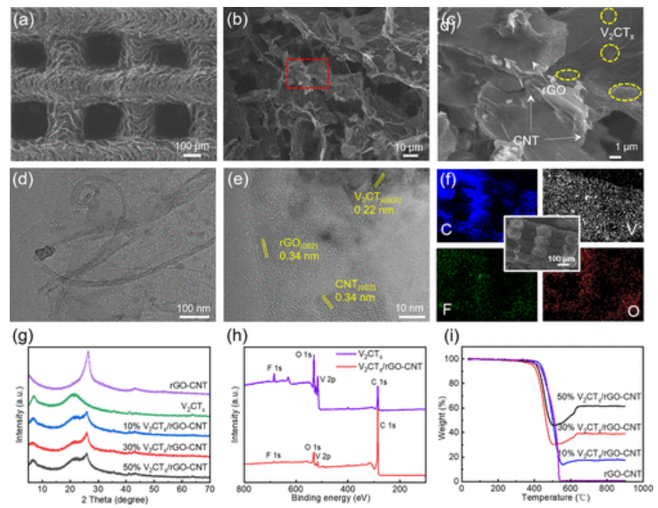 Figure 2. (a-c) 30% V2CTx/rGO-CNT 微網(wǎng)格氣凝膠的 SEM 圖像。(d) V2CTx/rGO-CNT 納米復(fù)合材料的 TEM 和 (e) HRTEM 圖像。 (f) V2CTx/rGO-CNT 微網(wǎng)格氣凝膠橫截面的 SEM 和相應(yīng)的 EDS 元素映射。 (g) rGO-CNT、V2CTx 和 V2CTx/rGO-CNT 納米復(fù)合材料的 XRD 圖譜。 (h) V2CTx MXene 和 V2CTx/rGO-CNT 的 XPS 光譜。 (i) rGO-CNT 和 V2CTx/rGO-CNT 納米復(fù)合材料的 TGA 曲線。