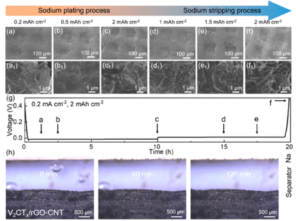 -2的剝離容量; (g) 相應(yīng)的沉積-剝離曲線。 (h) Na 在 V2CTx/rGO-CNT 電極上以 1 mA cm