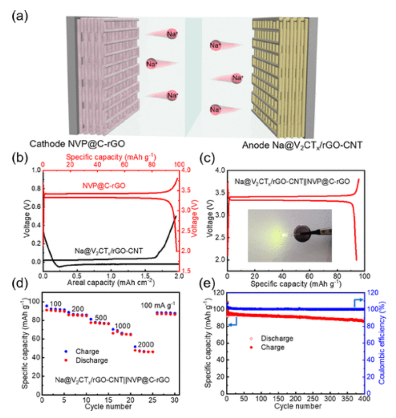 Figure 6. Na@V2CTx/rGO-CNT||NVP@C-rGO全電池電化學(xué)性能評(píng)價(jià)。 (a) 完整電池示意圖。 (b) NVP@C-rGO 正極和 Na@V2CTx/rGO-CNT 負(fù)極的恒電流充放電 (GCD) 曲線。 (c) 100 mA g