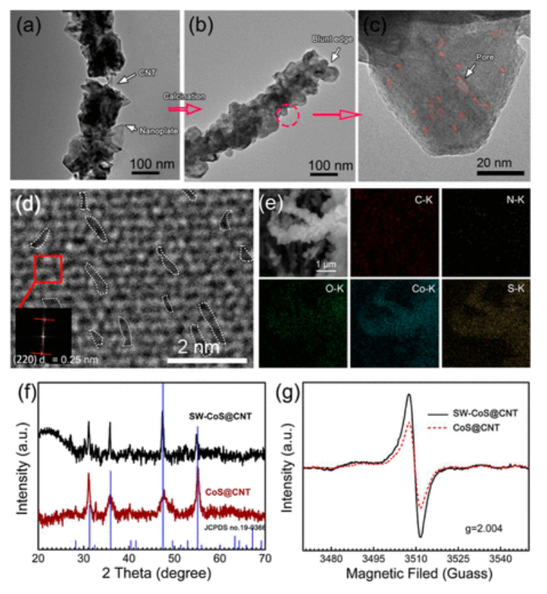 Figure 2. 材料的 TEM 形貌、能量色散光譜 (EDS) 元素分布、高分辨率透射電子顯微鏡 (HRTEM)、X 射線衍射 (XRD) 和電子順磁共振 (EPR) 結(jié)構(gòu)分析,包括 (a) CoS 的 TEM 圖像@CNT,(b) SW-CoS@CNT 的 TEM 圖像,(c) TEM 圖像中 SW-CoS@CNT 的孔分布,(d) SW-CoS@CNT 的 HR-TEM 圖像,清楚地顯示缺陷 ( S空位),插圖是CoS1.097的(220)平面的晶格空間。 (e) SW-CoS@CNT 的元素映射圖像。 (f) CoS@CNT和SW-CoS@CNT的XRD圖,均與CoS1.097標(biāo)準(zhǔn)卡相匹配。 (g) CoS@CNT 和 SWCoS@CNT 的 EPR 圖像,峰的位置表明存在 S 缺陷。