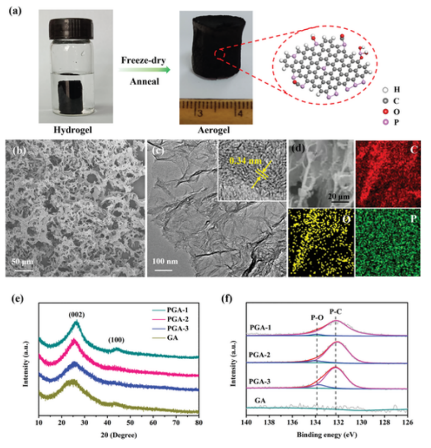 Figure 1. a)合成過(guò)程的示意圖。 b) SEM 圖像,c) TEM 圖像(插圖 HR-TEM 圖像),和 d) PGA-2 的 EDS 映射。 e) XRD 圖案和 f) 所有樣品的 P 2p 的高分辨率 XPS 光譜。