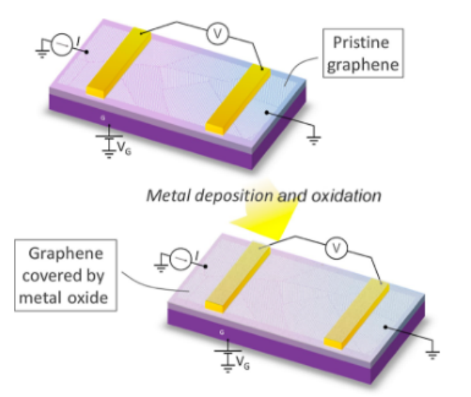 圖 1. 石墨烯場效應器件在 Al/Ti 沉積和氧化前后的實驗方案。