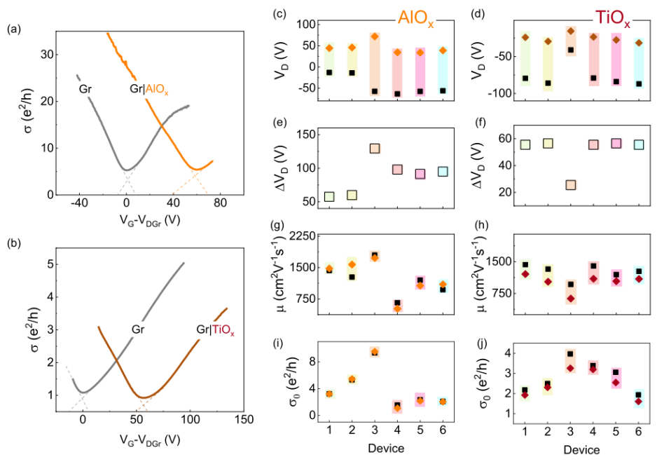 x 沉積之前(灰色曲線)和之后(橙色/棕色曲線)的狄拉克曲線。 此處提供的虛線用于指導 Dirac 點展寬。 (c-j) Dirac 點位置 (VD) 及其位移 (ΔVD)、場效應電子遷移率 (μ)、原始石墨烯 (黑色正方形) 的最小電導率和 AlO