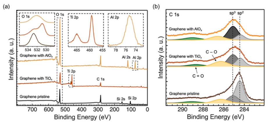 圖 3. XPS 表征。(a) 原始石墨烯(深棕色)、沉積 TiOx(棕色)和 AlOx(橙色)的石墨烯的概覽光譜,以及 (b) 用于最小二乘擬合的 C 1s 成分。 所有光譜均使用單色 Al K