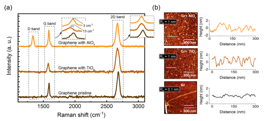 金屬氧化物對石墨烯的粘附對于石墨烯納米電子和自旋電子界面具有根本意義。 氧化鈦和氧化鋁是此類器件中兩種廣泛使用的隧道勢壘,它們提供最佳的界面電阻和控制傳輸參數和器件性能的不同界面條件。 在這里,我們通過電傳輸測量和拉曼光譜和光電子光譜,結合這些界面的從頭算電子結構計算,揭示了這些金屬氧化物如何與石墨烯界面的根本差異。 雖然兩個氧化物層都會導致石墨烯中的表面電荷轉移誘導 p 型摻雜,但與 TiO
