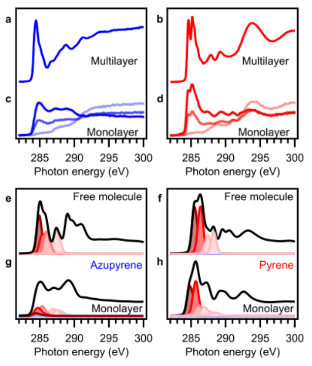圖 5. 碳 K 邊 NEXAFS 數據揭示了模型缺陷Azupyrene未占軌道的相互作用引起的變化。 實驗光譜:(a,b)多層;(c,d)(a,c)Azupyrene和(b,d)Pyrene的單層。多層光譜是用相對于表面法線方向為 53° 的電場矢量拍攝的,而單層光譜是用配色方案指示的角度拍攝的(25°,粗體色;53°,中間色;90°,微弱 顏色)。 自由分子 (e,f) 和單分子層 (g,h) 的 DFT 計算的 NEXAFS 光譜的 MO 投影分析:(e,g) Azupyrene; (f,h) 芘。LUMO 的貢獻為深紅色,更高軌道的貢獻為逐漸變淺的顏色; 黑色的總光譜。 計算的光譜被嚴格地移動了 -6 eV 以匹配實驗能量標度。