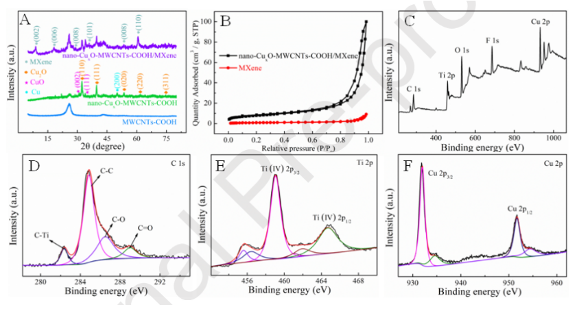 圖3. (A) MWCNTs-COOH、nano-CuxO-MWCNTs-COOH和nano-CuxO-MWCNTs-COOH/MXene的XRD譜圖。(B) MXene和nano-CuxO-MWCNTs-COOH/MXene的氮吸附/脫附等溫線。(C) nano-CuxO-MWCNTs-COOH/MXene的XPS光譜和C 1s (D)、Ti 2p (E)、Cu 2p (F)的高分辨率光譜。