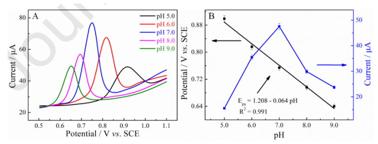 圖6. (A) nano-CuxOMWCNTs-COOH/MXene/GCE在不同pH值的PBS中測定10.0 μM BN的DPV曲線。(B) pH值對E