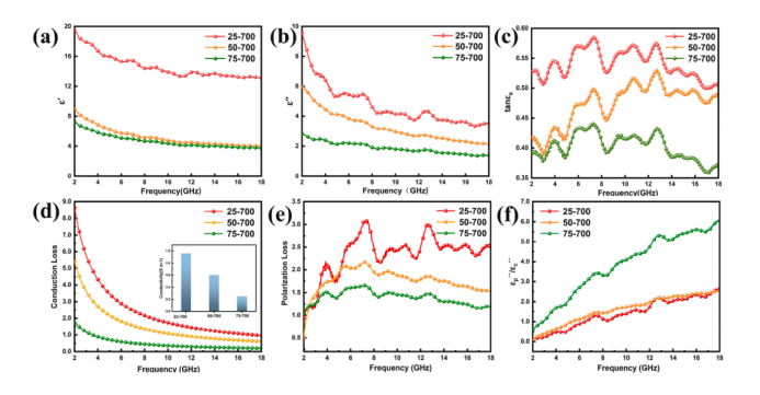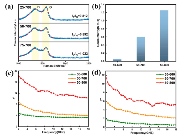 圖7 (a) PCM-50-600、PCM-50-700和PCM-50-800的拉曼圖(b) pcm的電導(dǎo)率,復(fù)合材料的電磁參數(shù)。