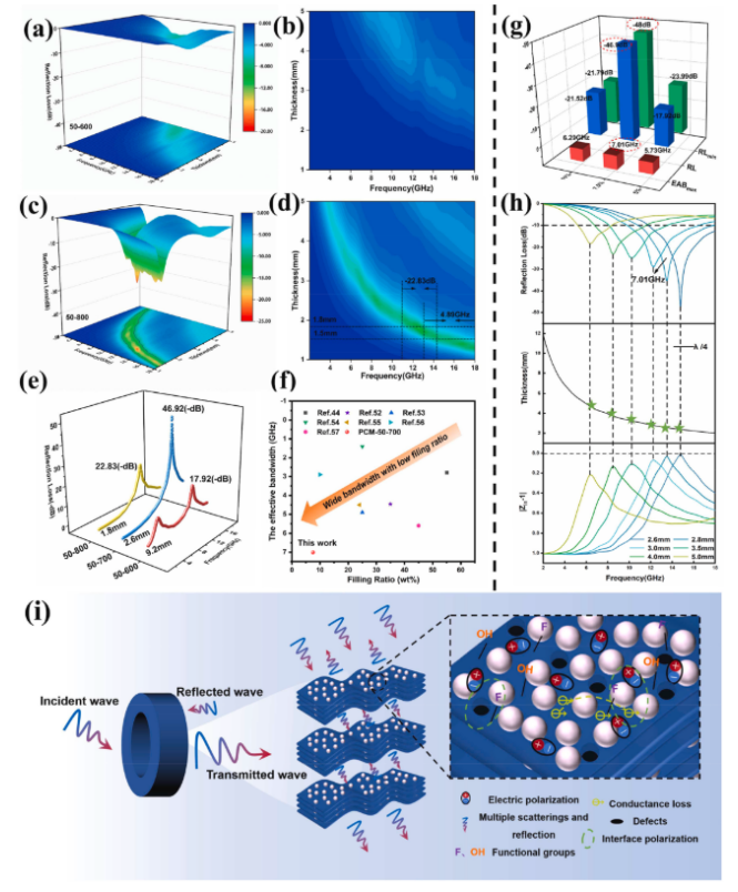 圖8. 三維和二維反射損失圖以及不同厚度的反射損失圖。