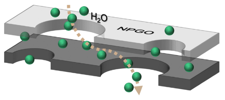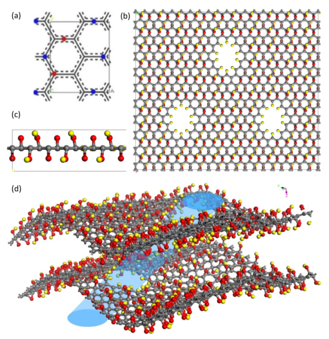 2重復單元、(b)納米多孔GO的正視圖、(c)氧化官能團分布的側面圖、和(d)錯位孔隙的2NPGO的分子構型(黃色:H原子,紅色:-OH中的O原子,藍色:O = O中的O原子,灰色:C原子)。