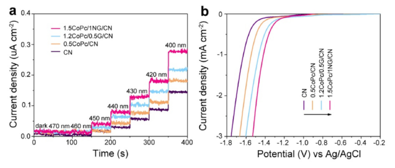4納米片(CoPc/NG/CN)異質結。相比于僅含CN時,優化的CoPc/NG/CN光催化劑在O