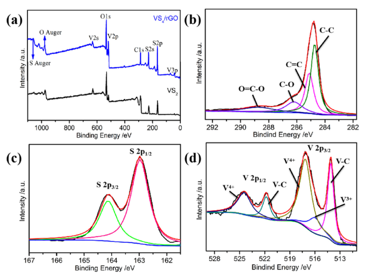 圖3. (a) rGO-改性VS4和VS2的XPS譜,rGO-改性VS4的(b) C 1s、(c) S 2p和(d) V 2p核級及對應的退卷積光譜。
