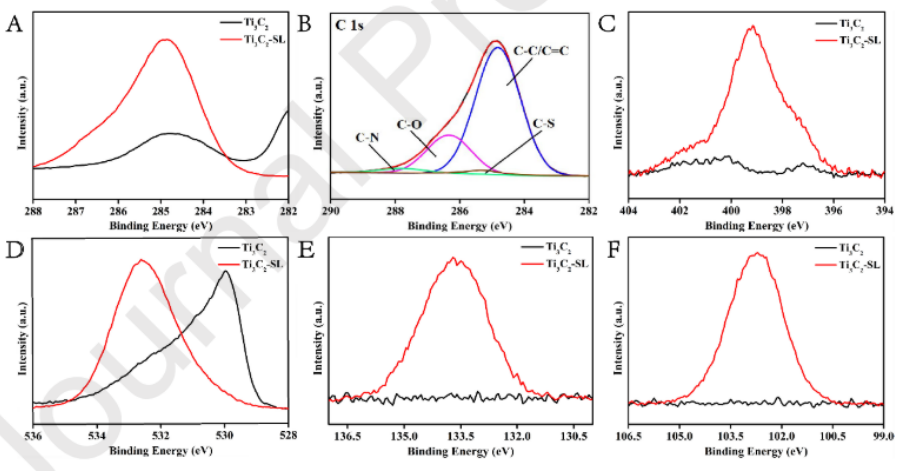 2- SL的XPS譜圖。C 1s (A)和(B), N 1s (C), O 1s (D), P 2p (E), Si 2p (F)。