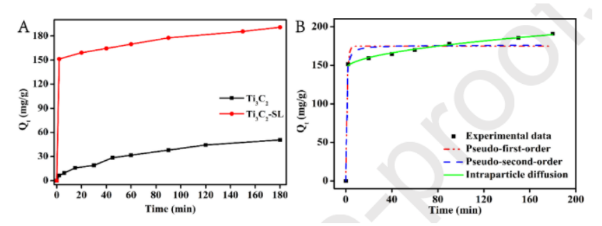 2和Ti3C2- SL上的吸附曲線(A);擬一階模型、擬二階模型和粒子內擴散模型擬合的Ti