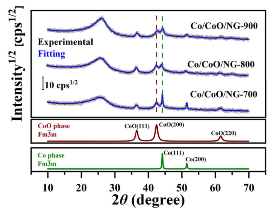 圖1. 不同熱解溫度(700、800、900℃)下Co/CoO/NG樣品的X-射線衍射分析