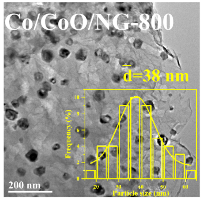 圖2. Co/CoO/NG-800樣品的TEM圖像和粒徑分布曲線(插圖) 。