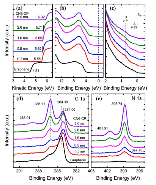圖2. (a) SECO在低動(dòng)能區(qū)的UPS光譜,(b) 低結(jié)合能區(qū)的價(jià)帶特征和(c) EF附近的相應(yīng)特寫(xiě)光譜,以及CN6-CP 在石墨烯上連續(xù)沉積過(guò)程中的XPS核心能級(jí)的(d) C 1s和(e) N 1s光譜。