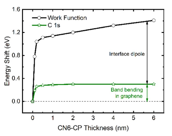 表面電荷轉(zhuǎn)移摻雜石墨烯具有結(jié)構(gòu)簡(jiǎn)單、摻雜效率高、易于控制等優(yōu)點(diǎn),在石墨烯基電子器件中占有重要地位。在本研究中,我們利用p型強(qiáng)分子摻雜劑六氰基-三甲烯-環(huán)丙烷(CN6-CP)演示了石墨烯表面電荷轉(zhuǎn)移空穴的有效摻雜。原位光電子能譜研究表明,CN6-CP具有6.37 eV的高本征功函數(shù),促進(jìn)了石墨烯向CN6-CP的電子轉(zhuǎn)移。因此,石墨烯層在與CN6-CP直接接觸時(shí)出現(xiàn)了孔堆積現(xiàn)象。霍爾效應(yīng)測(cè)量結(jié)果表明,在6 nm CN6-CP蒸發(fā)后,石墨烯的面空穴密度從8.3x10